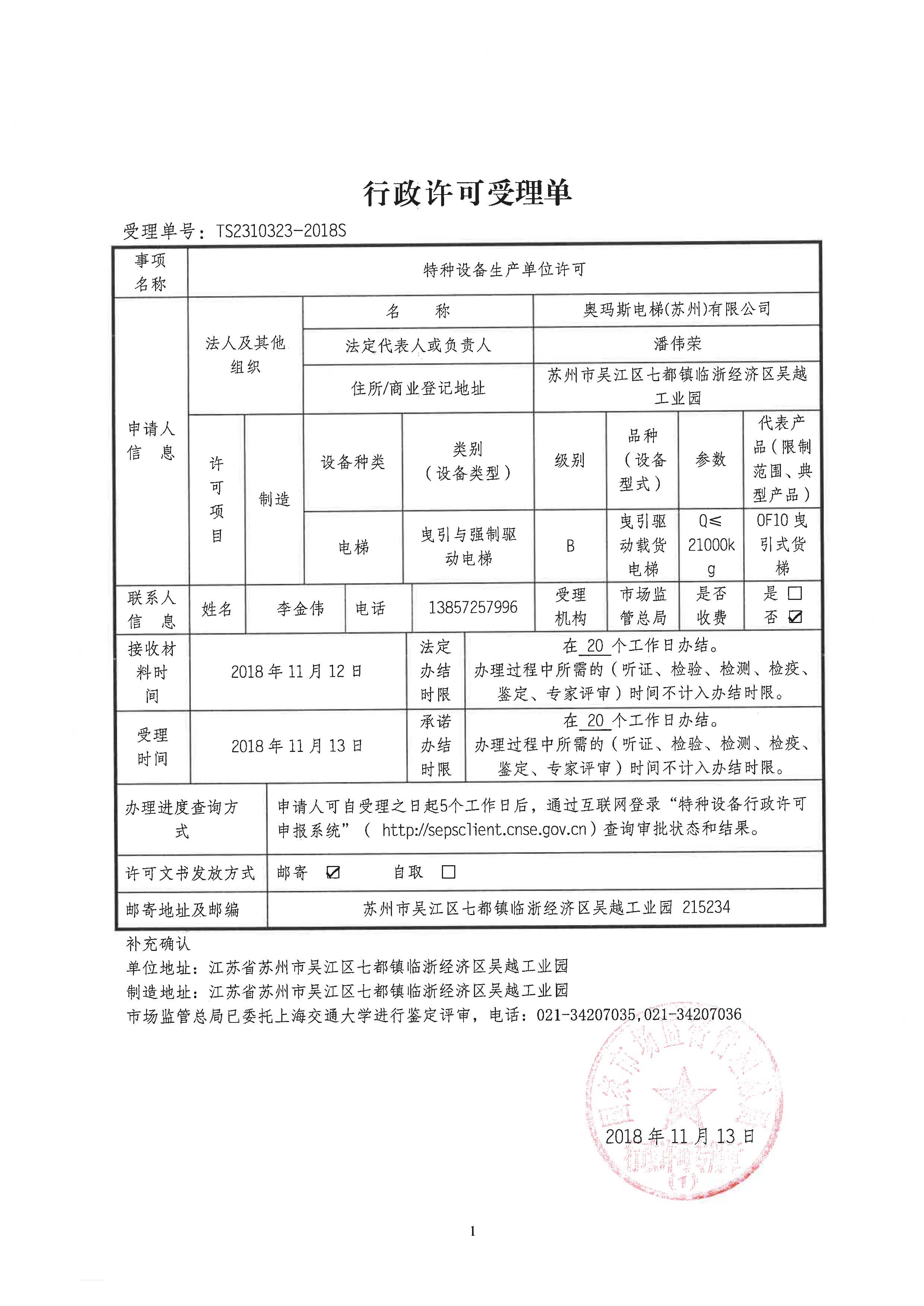在载货类电梯一系列的大研发投入、及性价比高的好产品的相继推向市场。乐动网官网的“回头客户”也越来越多,产品美誉度也越来越高。但乐动网官网人永不自满,不会因此固步自封。在激烈的市场竞争面前,乐动网官网人时刻保持着一份清醒与危机意识。所以只要有机会,乐动网官网人就不会轻意放弃。2018年乐动网官网公司根据中国电梯市场大吨位货梯的需求动向,果断接受常州某客户的要约,试制一台超大吨位的21T 速度0.33M/S的 6:1结构的载货电梯产品。目前该产品的试制许可申请已顺利通过国家市场监督管理总局的批准。(附“行政许可受理单”)