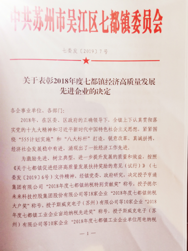 2019年2月14日,猪年初十,情人节。下午2:00时分,公司潘伟荣总经理从开会现场传来喜讯:乐动网官网荣获“2018年度吴江七都镇单位用电纳税先进奖” (见下列获奖名单及奖牌) 及“2018度年吴江七都镇单位纳税百强企业”的殊荣。这种荣誉,乐动网官网公司连续保持了4年。